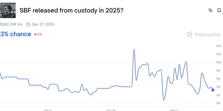 Der Markt scheint dieser Skepsis zuzustimmen. Polymarket-Daten zeigen, dass Händler SBF nur eine Chance von 3 % einräumen, im Jahr 2025 aus der Haft entlassen zu werden.
