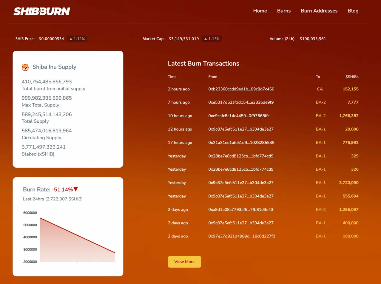 - Die Verbrennungsrate bricht innerhalb von 24 Stunden um 51,14 % auf 2,72 Millionen SHIB ein, wobei 410,75 Billionen Token aus der Erstversorgung verbrannt wurden.