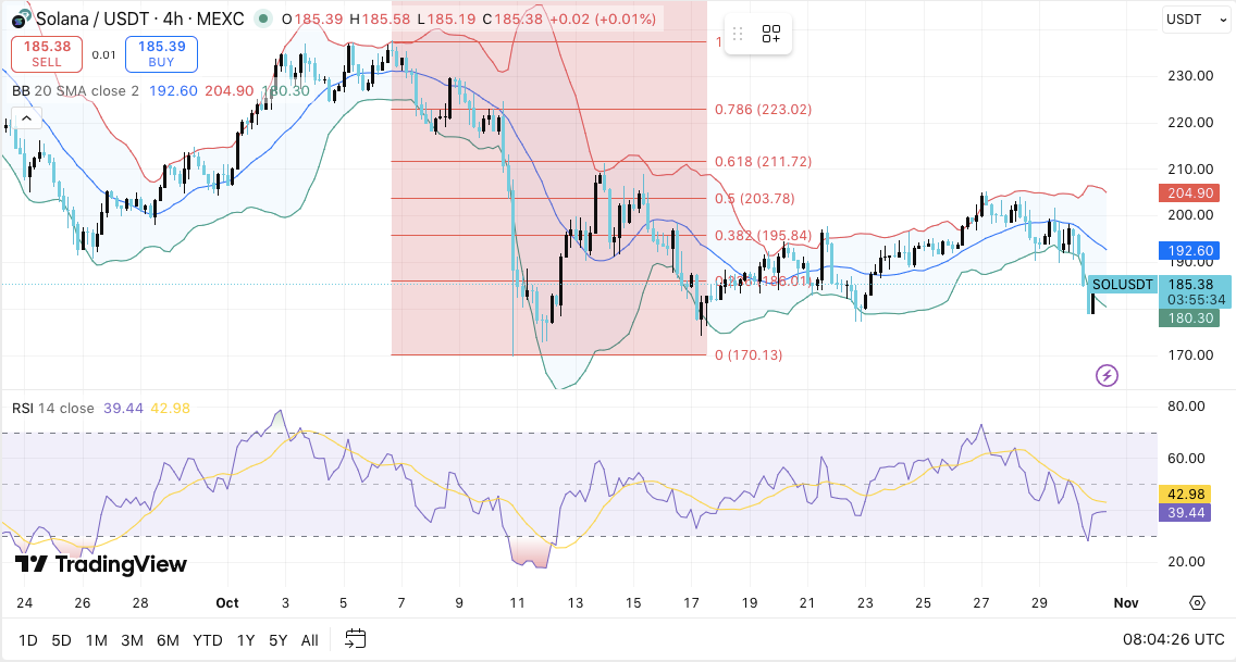 Solana (SOL) steht unter erneutem Verkaufsdruck, nachdem es nicht gelungen ist, das Widerstandsniveau von 190 $ zurückzuerobern. Die Kryptowährung wird in der Nähe von 185 $ gehandelt und bleibt damit unter dem mittleren Bollinger-Band, was auf eine Abschwächung der kurzfristigen Dynamik hindeutet. Analysten weisen darauf hin, dass der Zusammenbruch der jüngsten Unterstützung darauf hindeutet, dass die Verkäufer die Kontrolle wiedererlangt haben, wobei die Momentum-Indikatoren nach unten ausgerichtet sind.