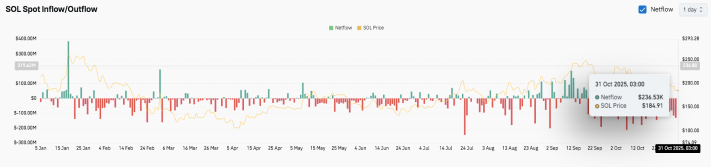 Die Spot-Zu- und -Abflüsse von Solana zeigen, dass sich die Anlegerstimmung im Laufe des Jahres 2025 verändert. Die Zuflüsse erreichten im Januar und Februar mit über 300 Millionen US-Dollar ihren Höhepunkt, was auf eine starke Akkumulation hindeutet.