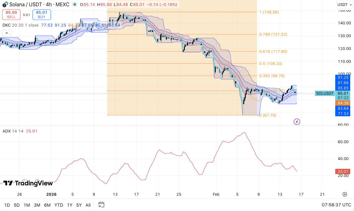Solana handelt nach einem starken Rückgang vom Swing-Hoch bei $148,88 nahe 85 US-Dollar. Der Vermögenswert steht trotz einer kürzlichen Erholung weiterhin unter Druck auf dem 4-Stunden-Chart. Die Verkäufer kontrollierten die Preisentwicklung wochenlang und erzwangen eine Abfolge von niedrigeren Hochs und niedrigeren Tiefs.