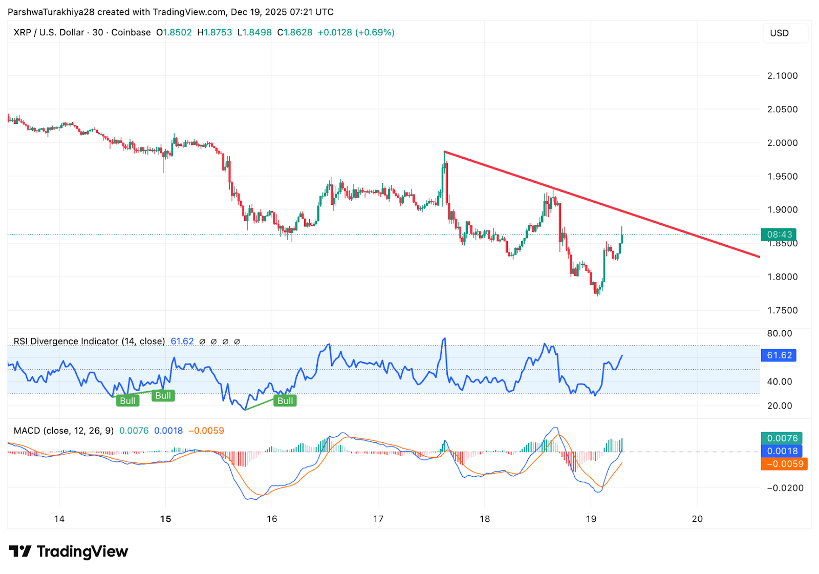 Kürzere Zeitrahmen zeigen, dass XRP versucht, zu basieren. Auf dem 30-Minuten-Chart hat sich der Kurs von den jüngsten Tiefs um 1,78 $ erholt, was höhere Intraday-Tiefs erreicht und gleichzeitig eine kurzfristige absteigende Trendlinie respektiert.