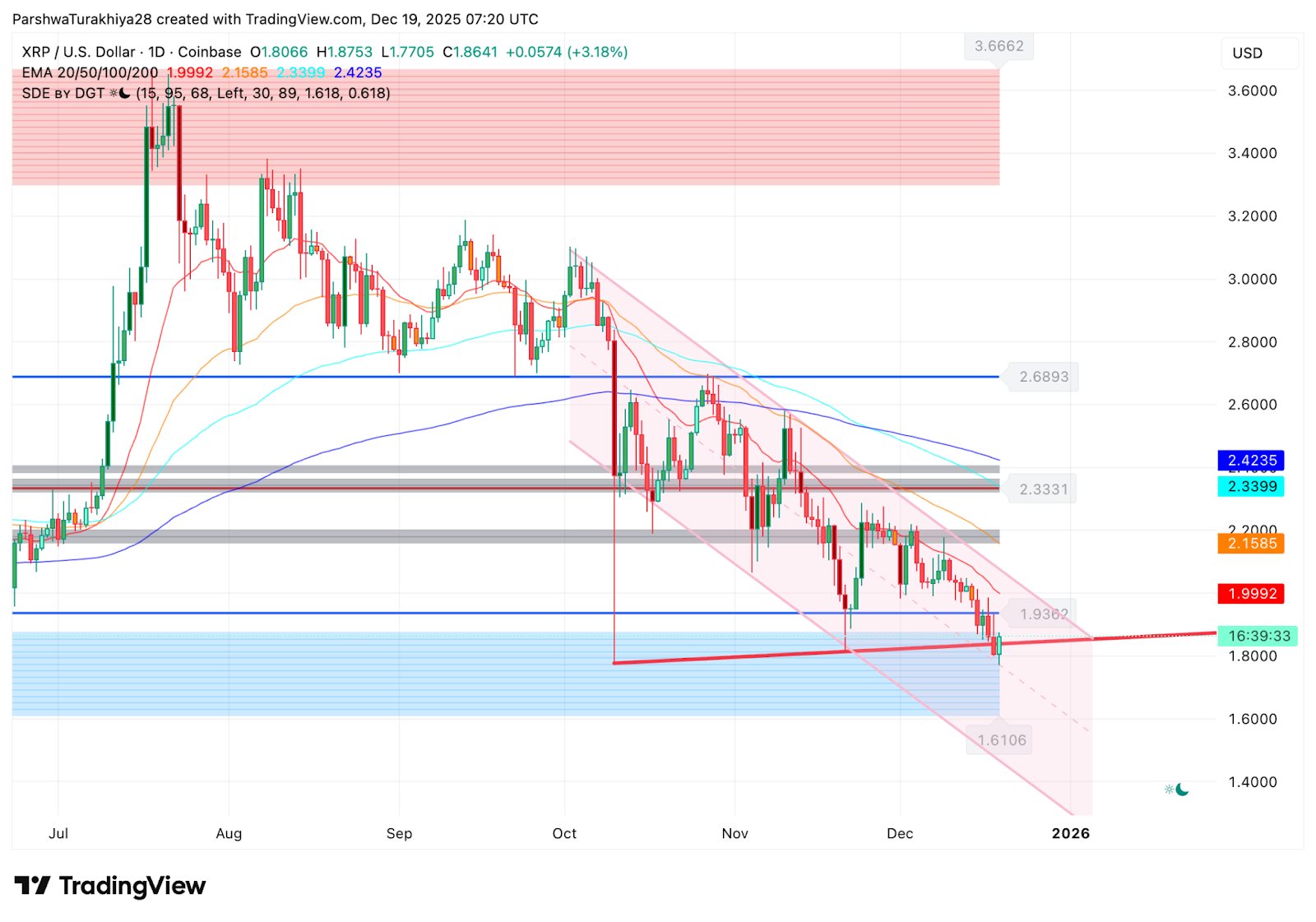 Im Tageschart bleibt XRP innerhalb einer absteigenden Struktur, die seit dem Juli-Höchststand bei 3,66 $ die Kursbewegung definiert hat. Der Preis handelt weiterhin unter den EMAs von 20, 50, 100 und 200 Tage, die zwischen 1,99 und 2,42 $ gestapelt sind und eine breite Widerstandsbandbreite bilden.
