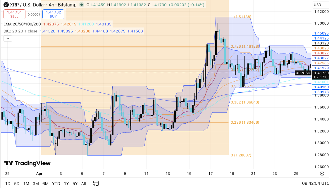Auf dem 4-Stunden-Chart hält XRP eine bullisch-neutrale Struktur bei. Der Preis bildet trotz Widerstand in der Nähe von $1,45 weiterhin höhere Tiefs. Dieses Muster geht oft Expansionsphasen voraus. Darüber hinaus hält sich XRP oberhalb der Nachfragezone von $1,30–$1,35 und verstärkt die zugrunde liegende Stärke.
