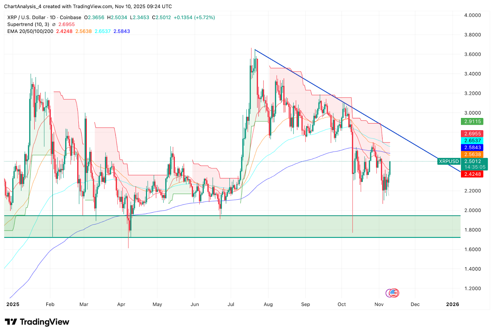 - Trotz des Anstiegs bleibt XRP durch den Widerstand an der absteigenden Trendlinie und dem EMA-Cluster zwischen 2,56 $ und 2,65 $ begrenzt.