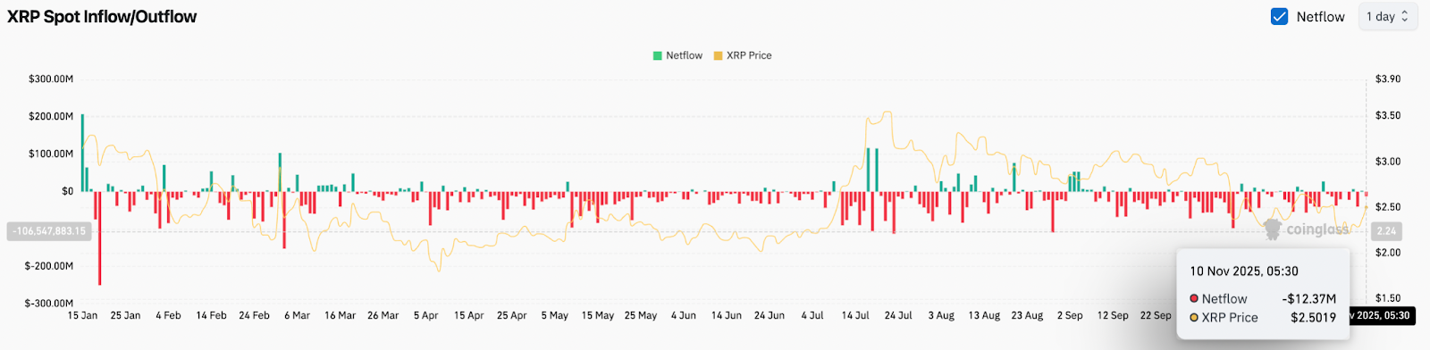 Das bedeutet, dass mehr XRP an die Börsen gelangt als sie verlässt, was im Allgemeinen den Verkaufsdruck unterstützt. Die Spot-Abflüsse zeigten im Oktober und Anfang November eine anhaltende Verteilung, was dem Korrekturtrend auf der Grafik entspricht.