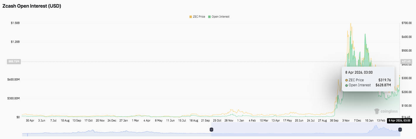 Unterdessen stützen offene Interessentrends die bullische Erzählung. Daten zeigen einen starken Anstieg des offenen Interesses Ende 2025, gefolgt von einer Stabilisierung. Stand April 2026 liegt das offene Interesse bei fast 628 Millionen US-Dollar. Dieses Niveau spiegelt ein anhaltendes Marktengagement trotz früherer Volatilität wider.