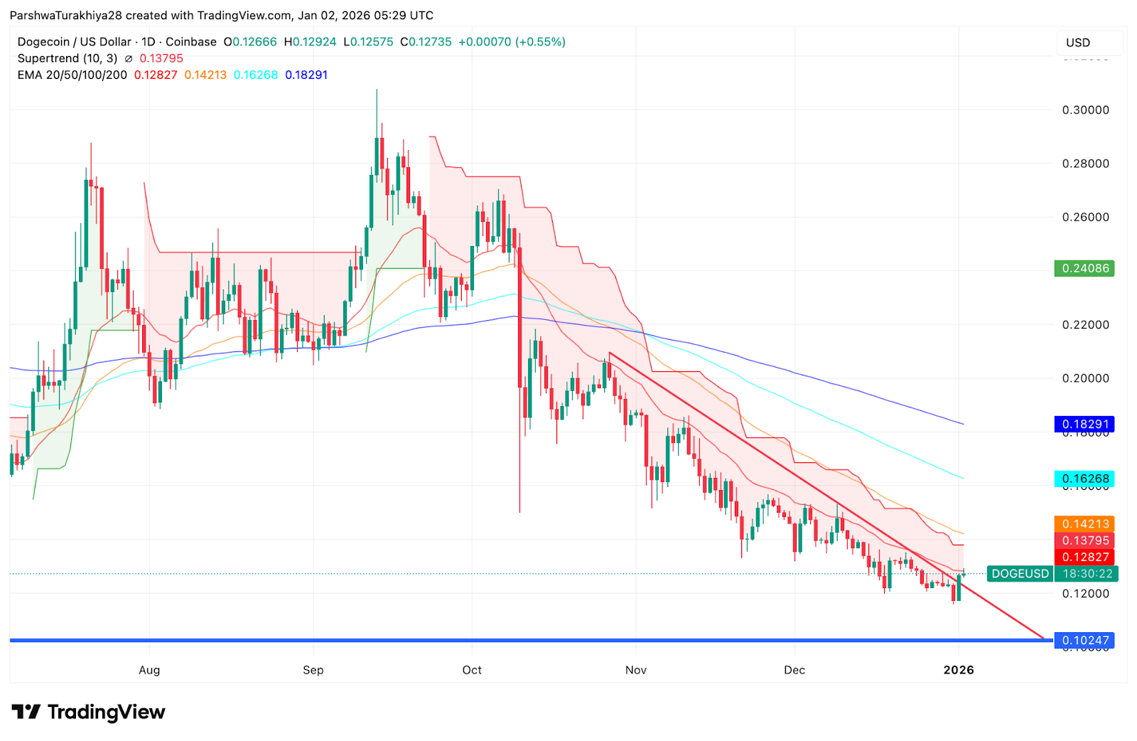 Price trades near $0.127, down roughly 74% from the October peak near $0.48. Supertrend sits at $0.1380, with price trading below all major EMAs at $0.128 / $0.142 / $0.163 / $0.183, maintaining a clean bearish structure.