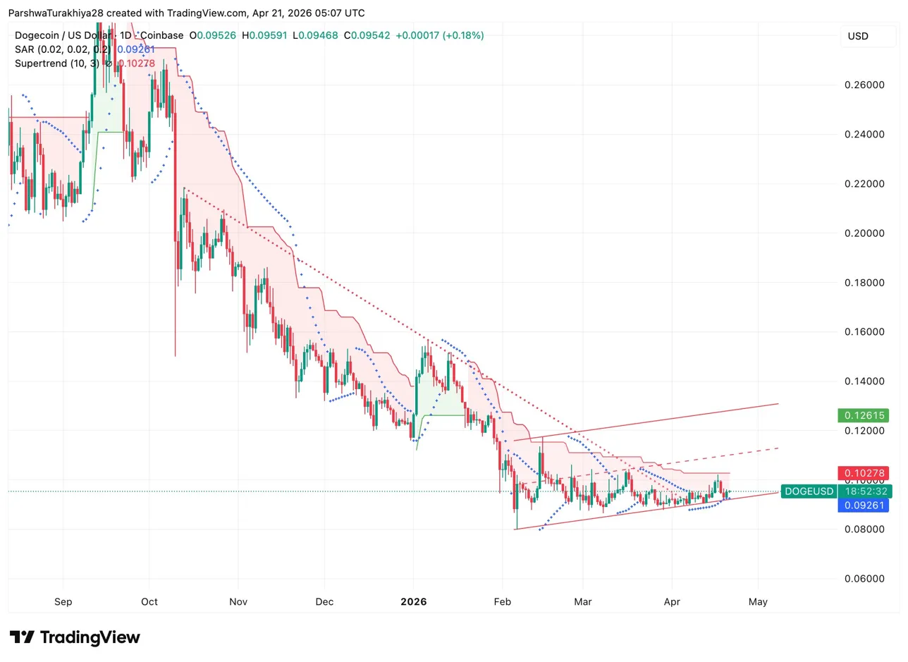 - DOGE trades at $0.0954, up 0.18%, inside the ascending wedge with SAR at $0.0926 below and Supertrend at $0.1028 overhead.
