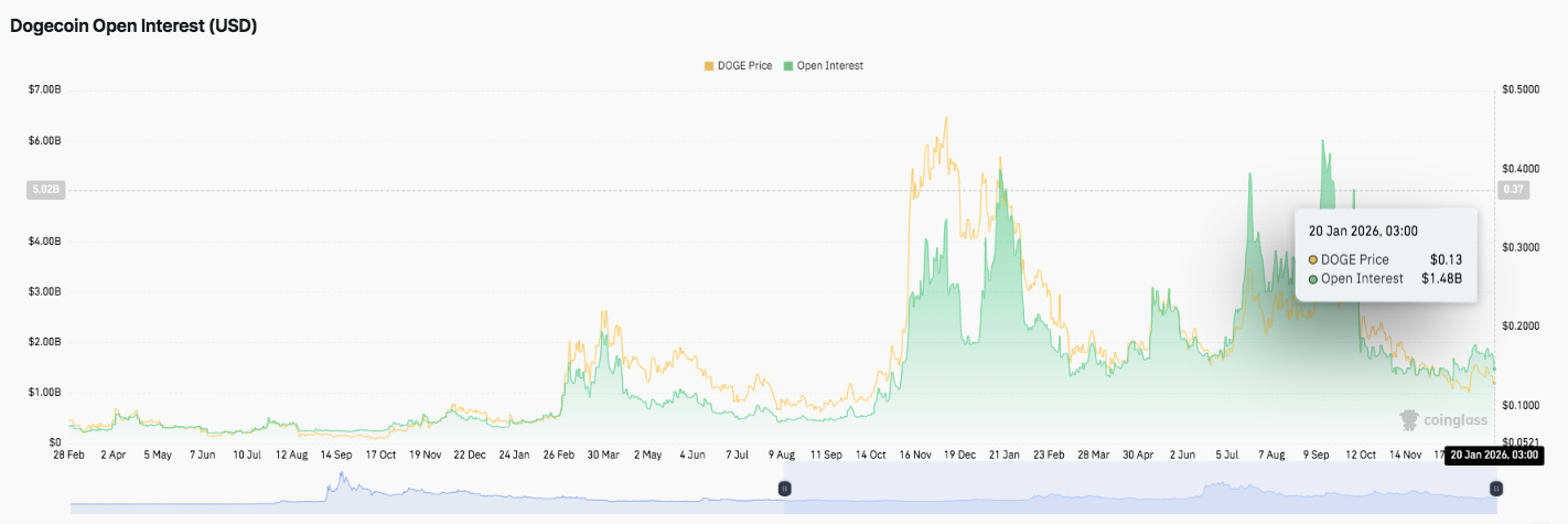 Open interest data adds context to the price weakness. Historically, DOGE open interest has followed boom-and-bust cycles tied to sharp rallies. During strong advances, leverage surged rapidly, then unwound as prices reversed. Consequently, speculative interest has proven unstable.