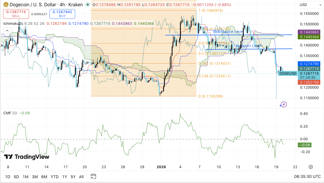 On the upside, $0.1314 stands as the first hurdle, followed by $0.1362 as the key mid-range reclaim level. A stronger breakout above $0.140–$0.145 would signal a trend shift and could open room for a larger recovery move. However, DOGE still trades below important Ichimoku levels, which keeps upside attempts limited for now.