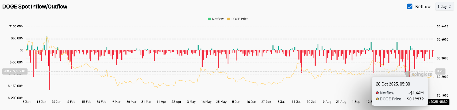 On-chain data shows net outflows of around $1.4 million on October 28, a modest figure compared with the heavy withdrawals seen earlier in 2025. The latest Dogecoin price volatility has been matched by softer outflows, hinting that traders are neither panic-selling nor heavily accumulating.