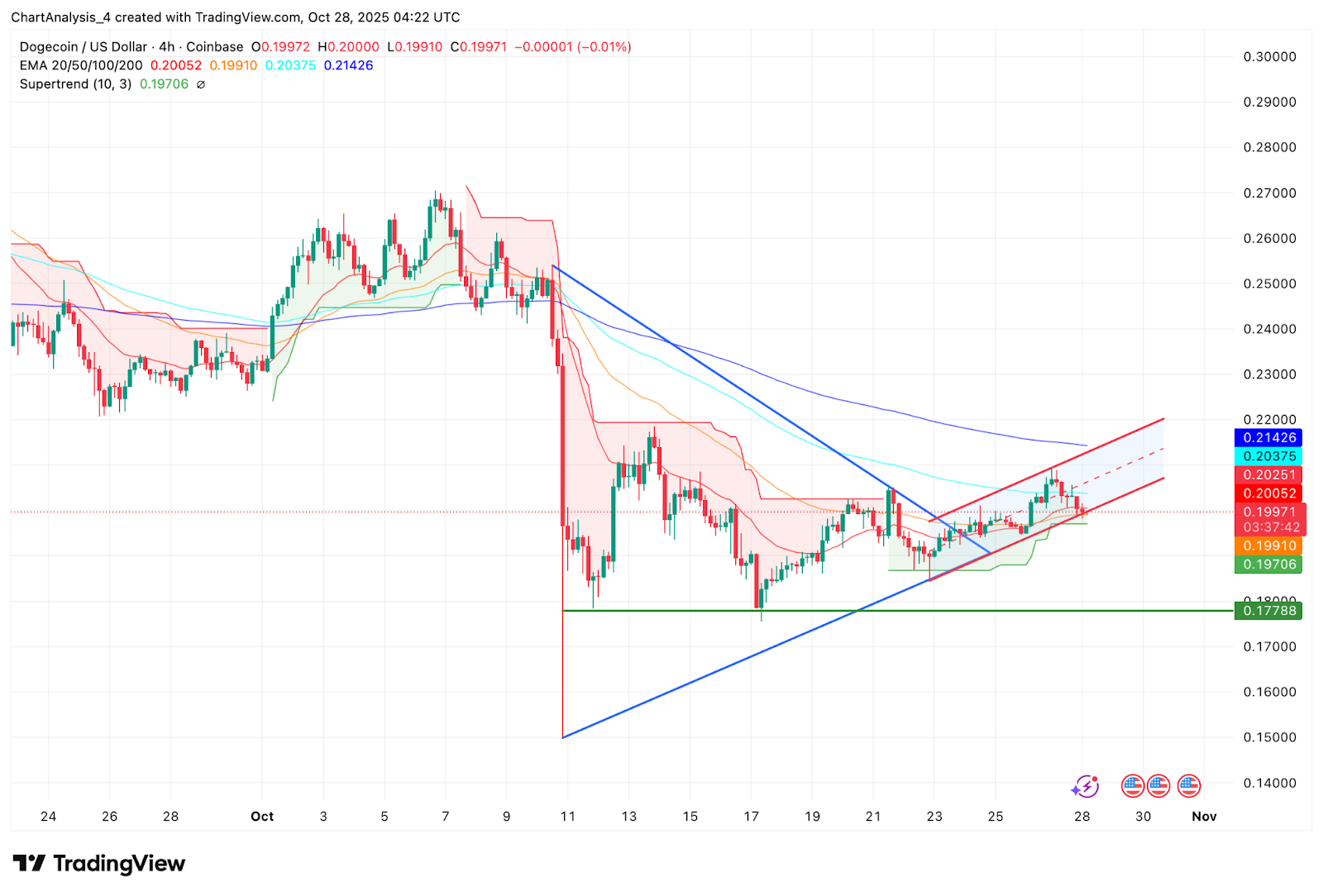 On the 4-hour chart, Dogecoin price action sits inside a narrow ascending channel after reclaiming ground from its October lows. The 20, 50, and 100 EMAs between $0.199 and $0.203 have merged into a compact support cluster that traders are actively defending.