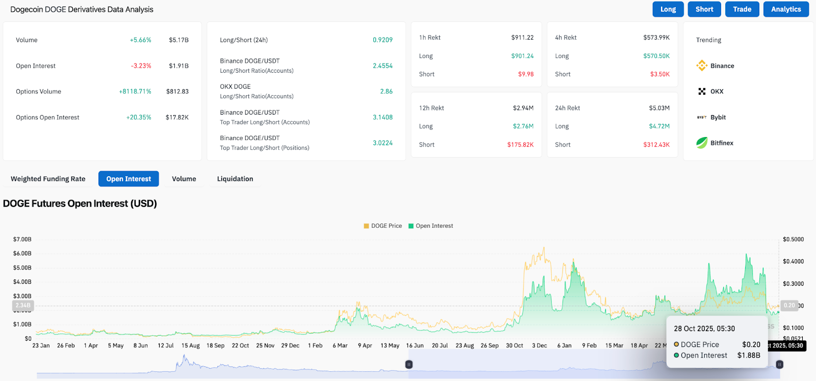 Dogecoin’s derivatives landscape reflects reduced leverage after last week’s liquidations. Futures open interest has slipped 3.2% to $1.91 billion, even as trading volume rose 5.6% to $5.17 billion. The mix points to short-term unwinding rather than fresh positioning.