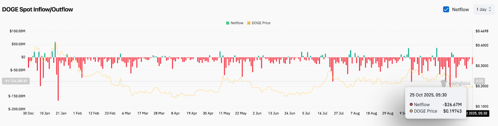 Coinglass spot flow data recorded $26.6 million in net outflows on October 25. Continuous outflows through the month point to sustained accumulation, suggesting fewer tokens are available on exchanges. This trend has historically coincided with pre-breakout phases in Dogecoin’s market cycles.
