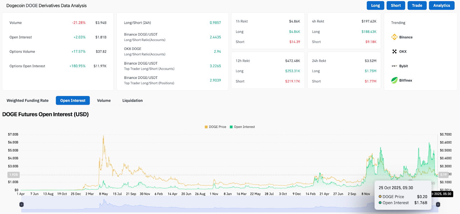 Across exchanges, the long-to-short ratio remains bullish. Binance, OKX, and Bybit show readings between 2.4:1 and 3.2:1, with top traders maintaining larger long exposure. Though total trading volume fell 21% to $3.94 billion, the increase in open interest suggests traders are preparing for directional volatility rather than exiting positions.