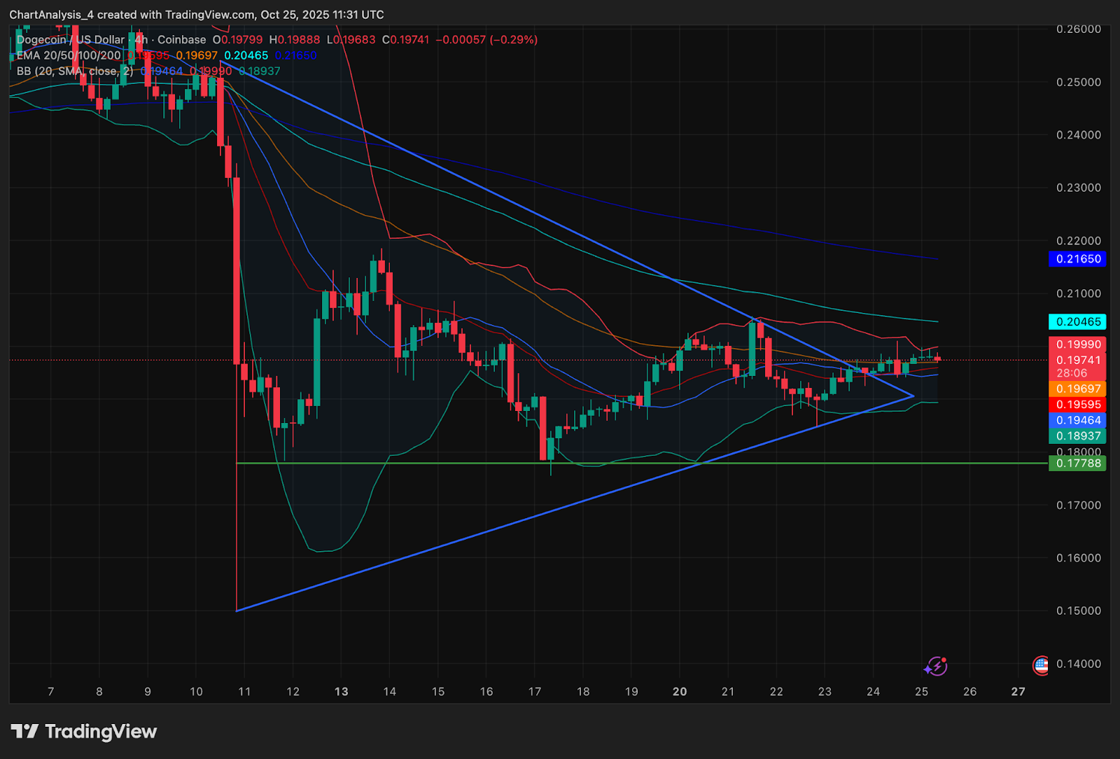 On the 4-hour chart, Dogecoin remains within a symmetrical wedge pattern that has developed since mid-October. The ascending base from $0.177 and descending resistance from $0.216 define the current range.