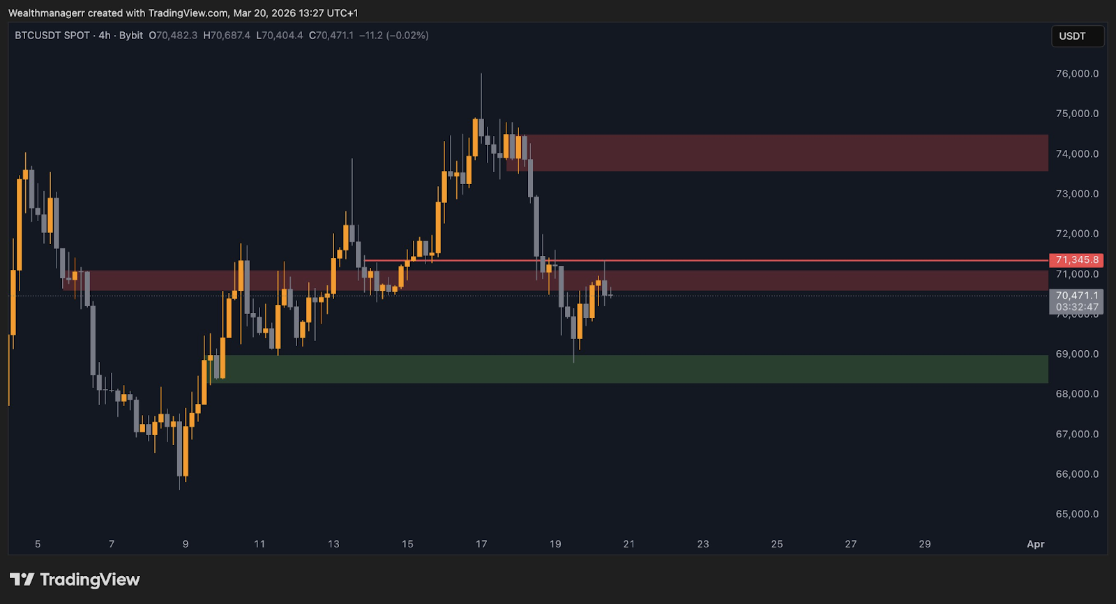 An analysis from Wealthmanager identifies $71,000 as a critical resistance level. The price recently rejected a higher supply zone between $74,000 and $75,000.