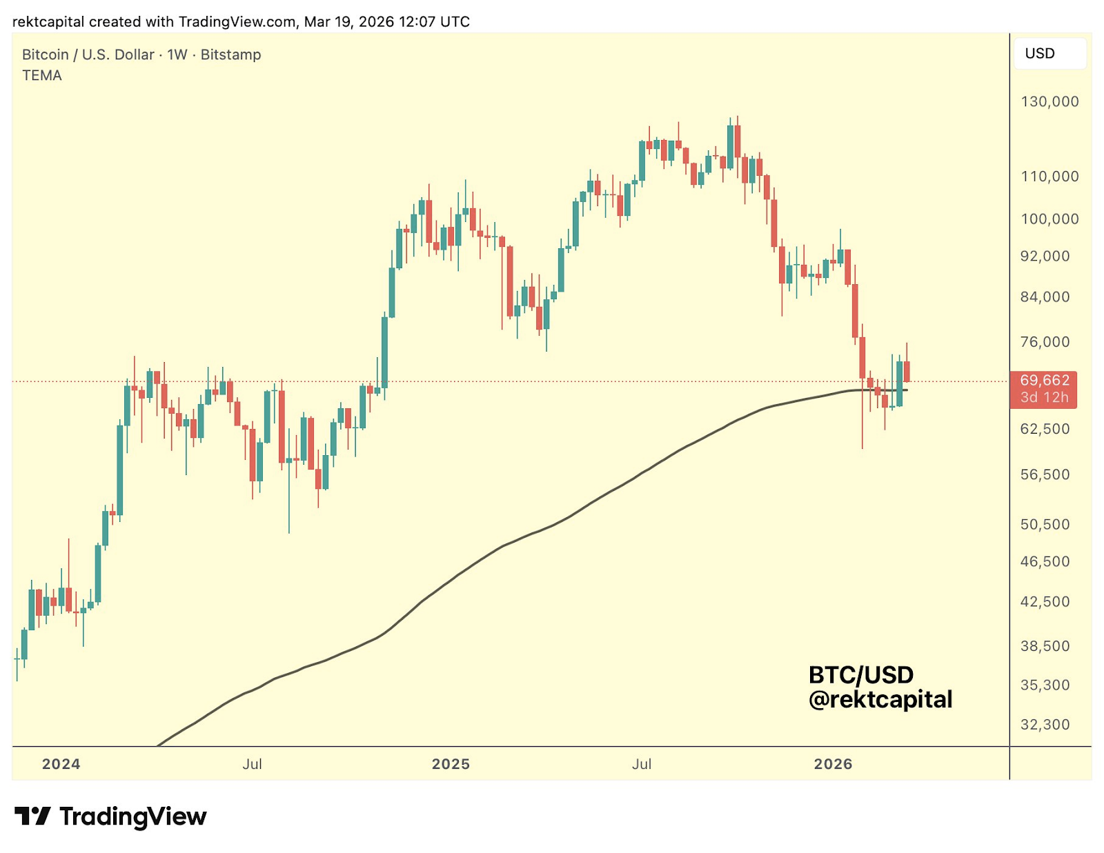 Analyst Rekt Capital highlights Bitcoin’s interaction with the 200-week exponential moving average. The asset recently broke above this level and now attempts to confirm it as support. However, price must hold above this threshold to validate the breakout.