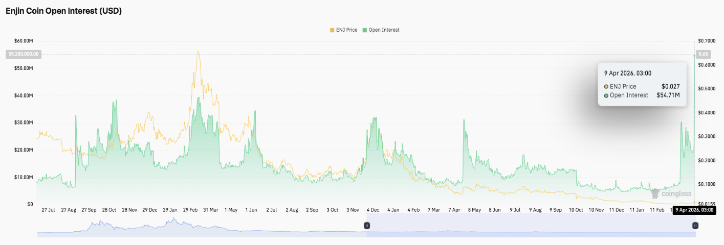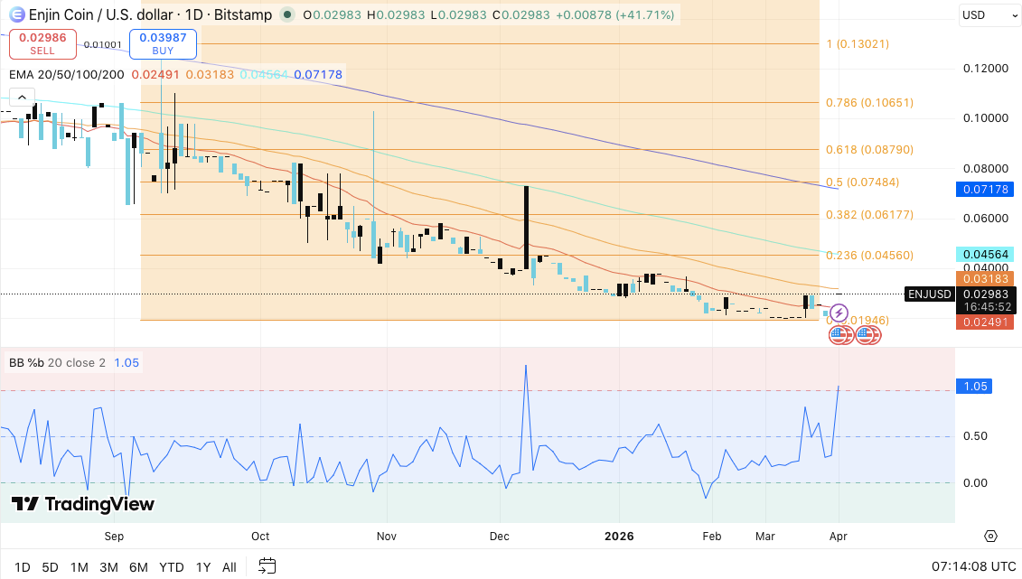 Enjin Coin price jumped sharply on Thursday, drawing renewed attention despite an ongoing bearish market structure. The token traded at $0.03117, posting a 52% daily gain and over 51% weekly growth.