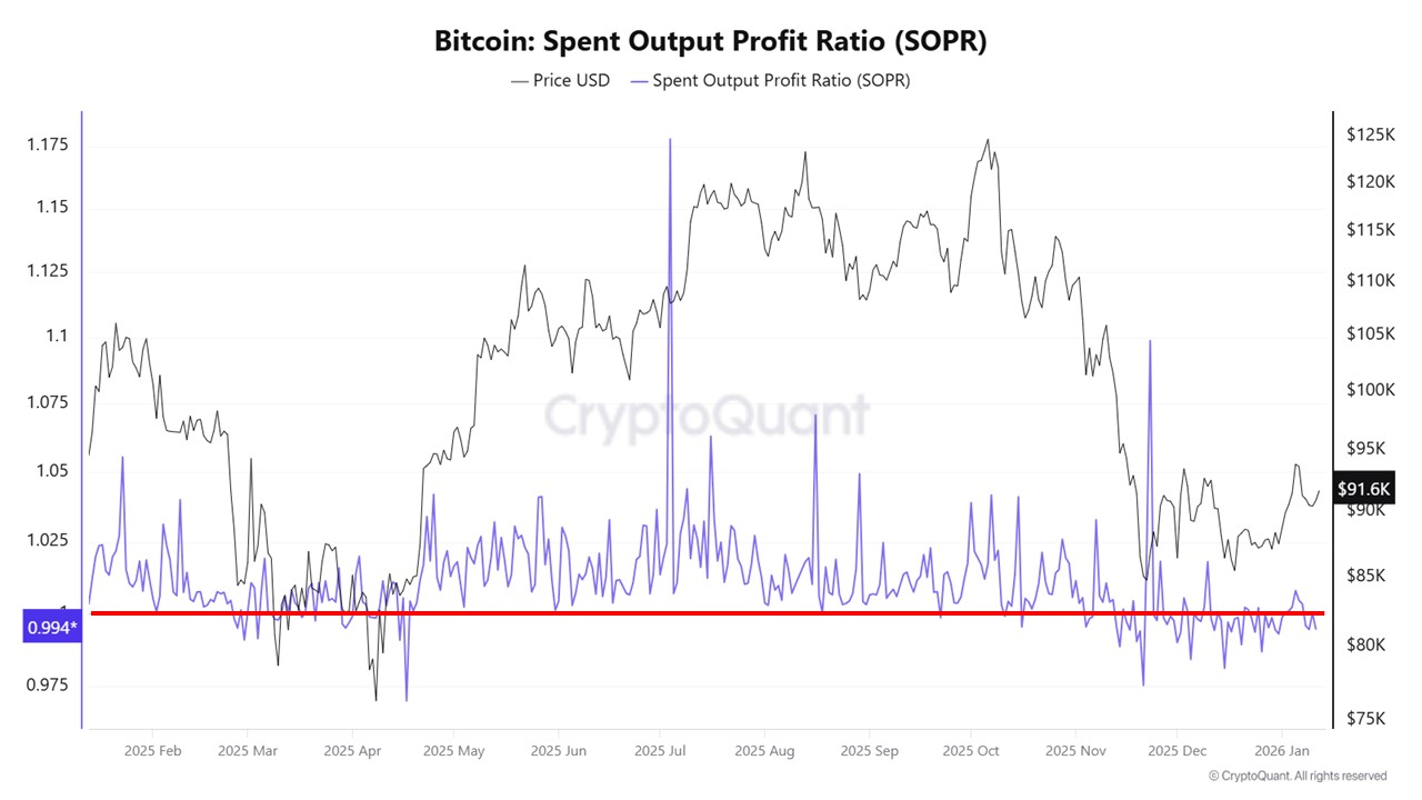 Otro indicador importante, conocido como SOPR, muestra que las monedas apenas se mueven y la toma de beneficios es limitada. En términos sencillos, los inversores están manteniendo en lugar de operar. Esto apunta a paciencia, no a miedo.