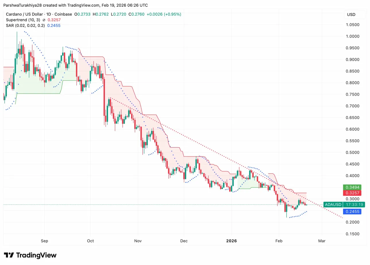 Cardano bajó de más de 0,95 dólares en septiembre a un mínimo cercano a 0,24 dólares en febrero, suponiendo una corrección del 75%. La consolidación actual cerca de 0,2760 dólares representa un rebote del 15% respecto a esos mínimos, pero la estructura sigue siendo decididamente bajista. Bajar por debajo de $0,2455 invertiría el SAR y expondría el apoyo psicológico de $0,24.