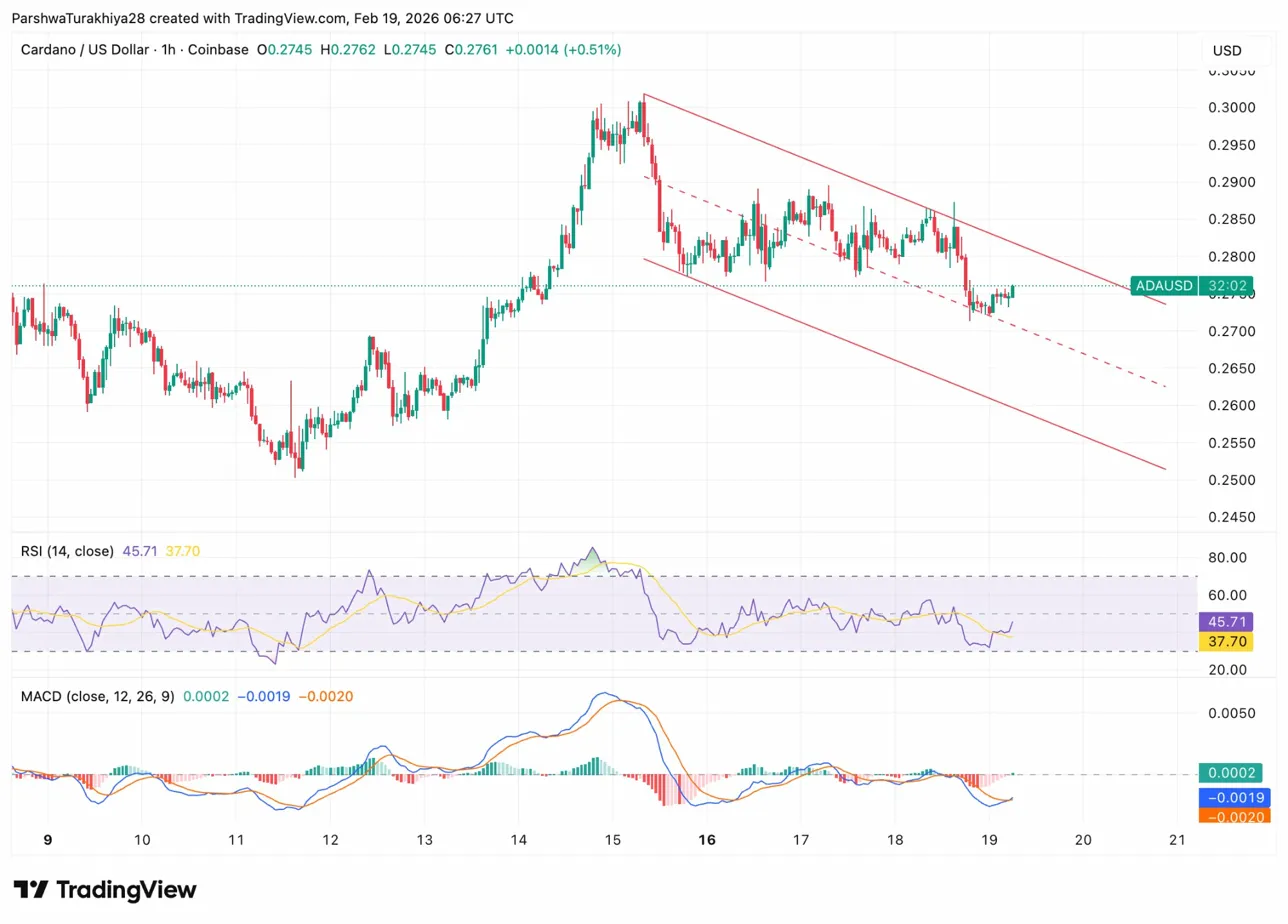 El gráfico de una hora muestra a Cardano atrapado dentro de un patrón de canal descendente con resistencia cerca de 0,2800 dólares y soporte en 0,2720 dólares. El RSI se sitúa en 45,71, neutral pero en descenso mientras el precio devuelve las ganancias de la sesión anterior. MACD permanece negativo con todas las líneas convergiendo cerca de cero.