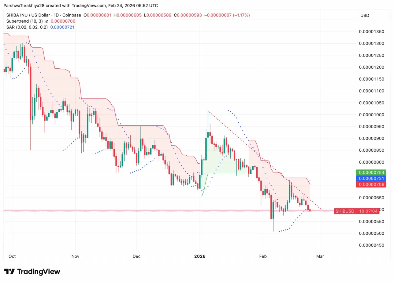 - El precio cotiza por debajo de Supertrend en $0,00000706 y SAR en $0,00000721 tras una corrección del 63% desde los máximos de octubre.