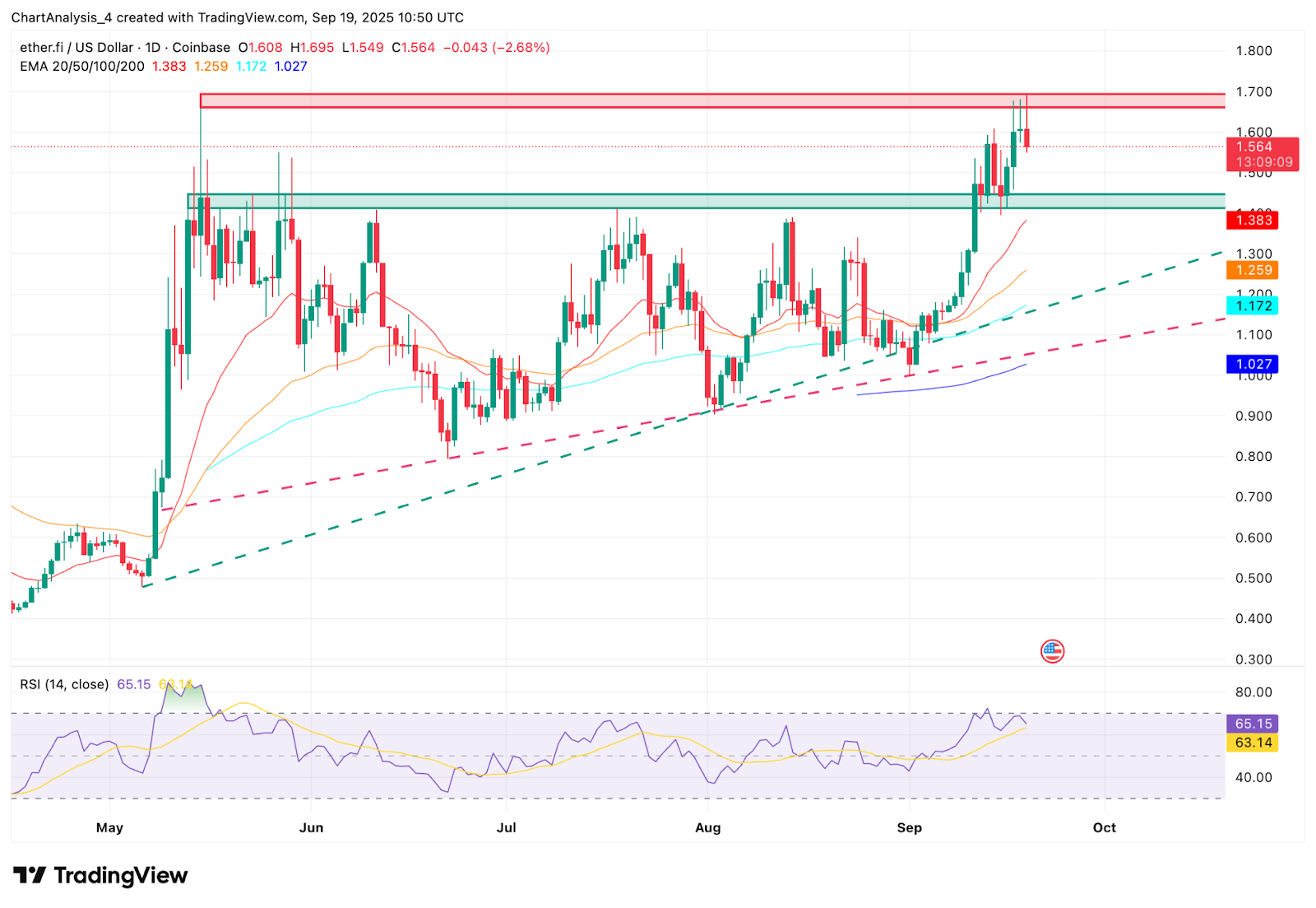 El precio de ETHFI se cotiza actualmente a 1,56 dólares, consolidándose después de probar la resistencia de 1,70 dólares. La línea de tendencia ascendente de abril continúa guiando mínimos más altos, mientras que el soporte inmediato se encuentra en $ 1.38.