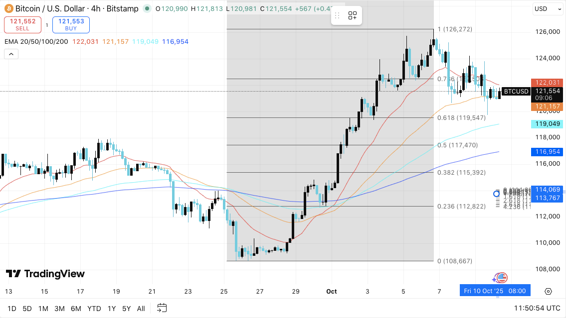 Los niveles críticos también son claros, con Bitcoin manteniendo alrededor de USD 121,550 después de ser rechazado en el último máximo de alrededor de USD 126,272. El gráfico de 4 horas indica que el retroceso está cerca de los niveles de retroceso de Fibonacci y de las principales medias móviles.
