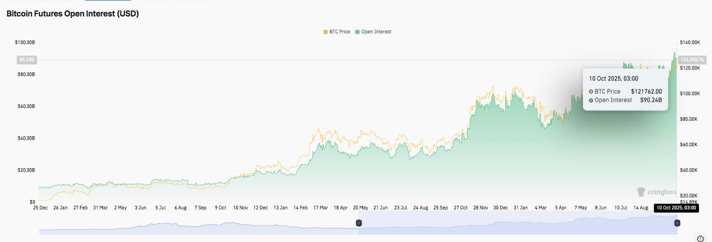 El interés abierto de los futuros de Bitcoin ha subido a USD 90.24 mil millones, el más alto desde que comenzó el ciclo alcista actual. Este aumento indica una mayor actividad especulativa y una participación apalancada. Tanto los traders institucionales como los minoristas están ampliando la exposición, lo que sugiere una creciente confianza del mercado a pesar de la reciente volatilidad.