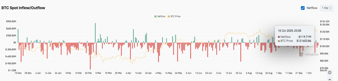 Los flujos netos al contado de Bitcoin no son estables, con entradas y salidas alternas hasta 2025. Los exchanges experimentaron una salida neta de 119,71 millones de dólares el 10 de octubre, cuando el token cotizaba a aproximadamente 121.600 dólares. Las continuas salidas desde finales de septiembre indican que los inversores están cobrando ganancias después de los nuevos máximos históricos.