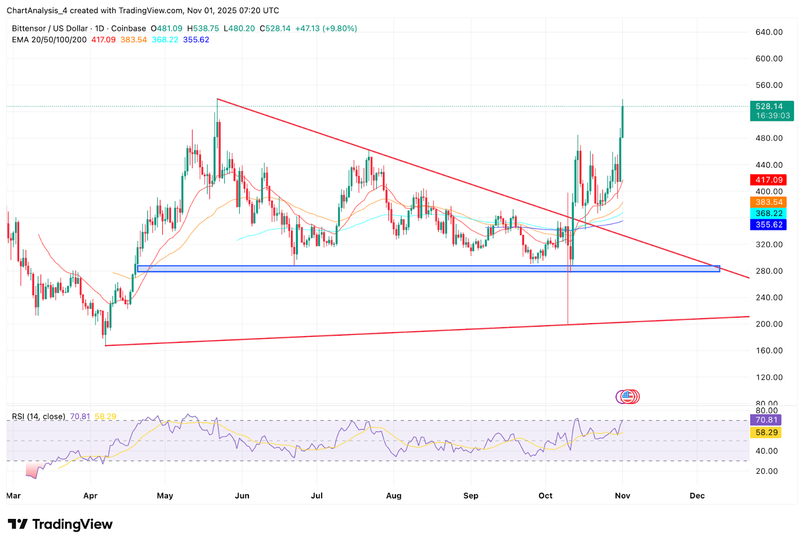 Técnicamente, el precio de Bittensor ha completado una ruptura limpia del triángulo descendente que había limitado las ganancias desde abril. El movimiento por encima de 480 dólares desencadenó compras aceleradas, enviando a TAO más allá de 528 dólares con un volumen creciente.