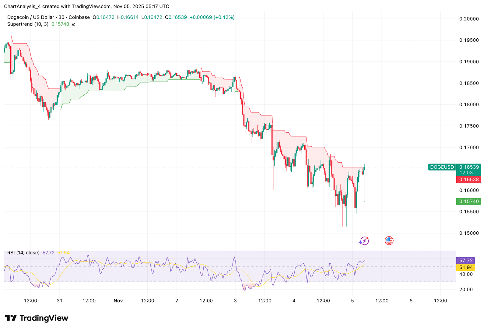 Los traders intradía están tratando de forzar una recuperación menor, pero hasta que DOGE cierre por encima de USD 0.171, el rebote carece de confirmación. Ese nivel marca la zona de cambio de supertendencia. Un rechazo aquí podría desencadenar otro tramo a la baja hacia USD 0.150.