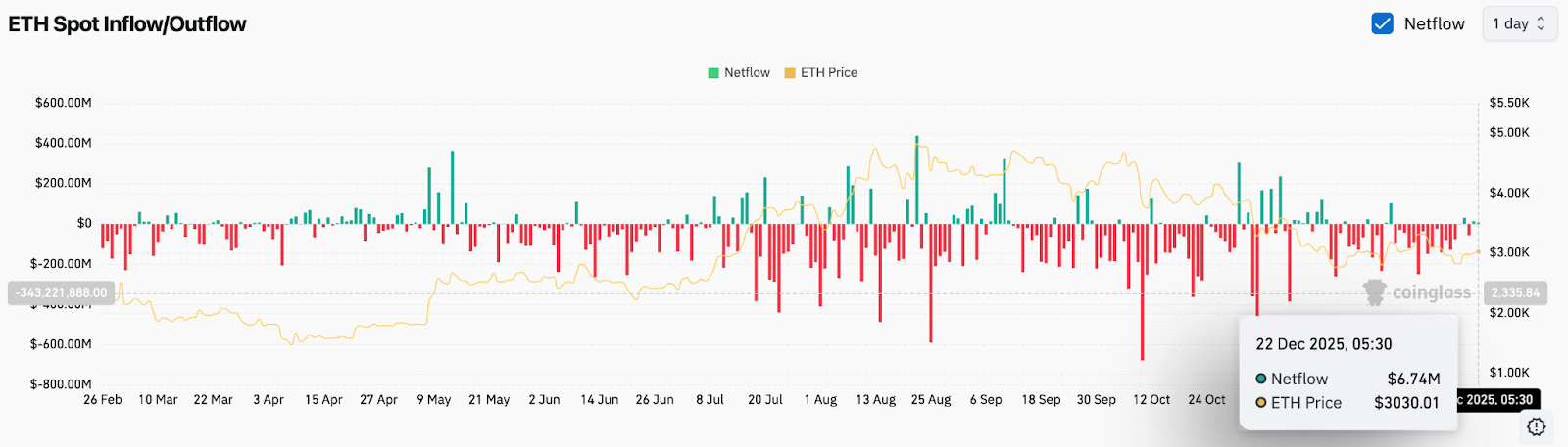 Los datos de flujo puntual siguen reflejando indecisión. Las sesiones recientes muestran entradas netas modestas, incluyendo aproximadamente 6,7 millones de dólares el 22 de diciembre, pero esto sigue a un prolongado periodo de salidas netas durante octubre y noviembre.