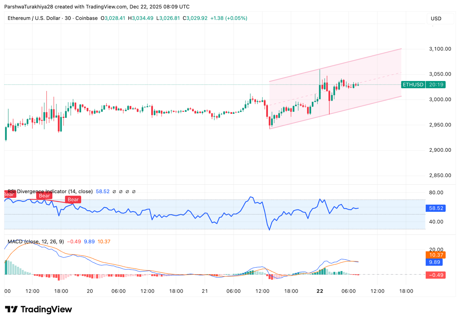 En el gráfico de 30 minutos, Ethereum está abriendo un canal al alza tras recuperarse del mínimo de 2.950 dólares. El precio se mantiene por encima del soporte de tendencia a corto plazo y va subiendo gradualmente, pero el impulso sigue siendo medido y no impulsivo.