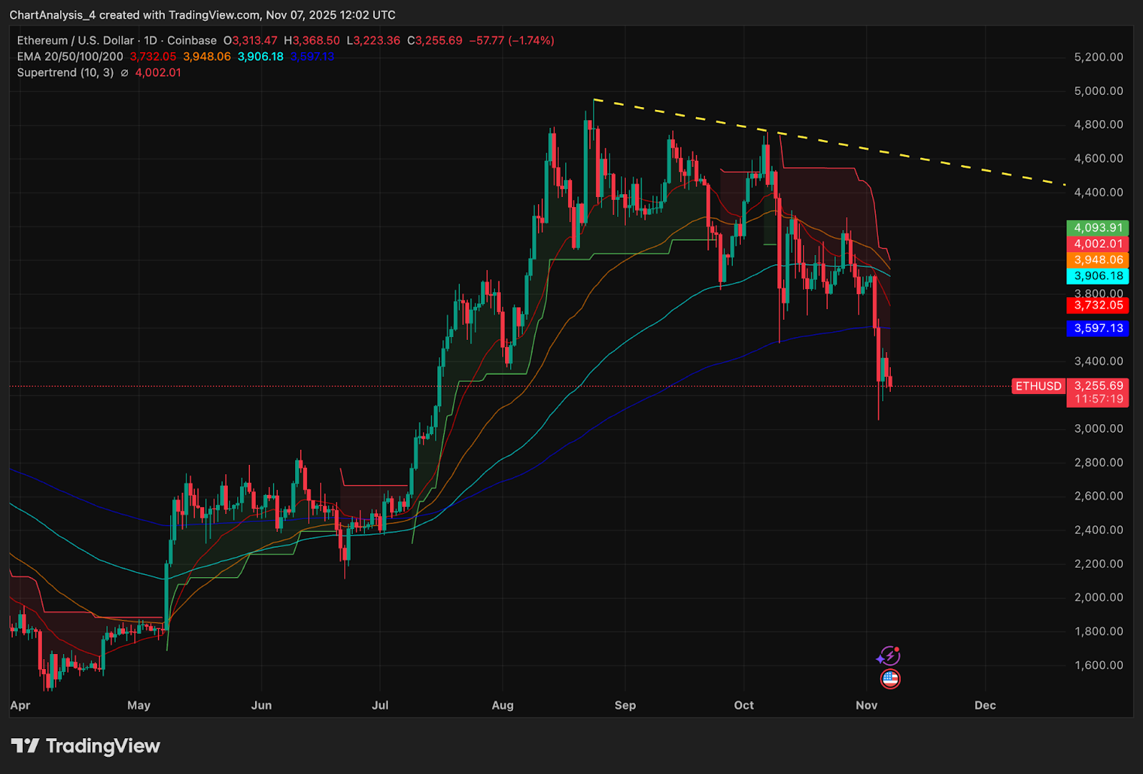 - El precio de Ethereum hoy cotiza cerca de $ 3,255 después de perder el soporte de $ 3,400 y rechazar la línea de tendencia descendente.