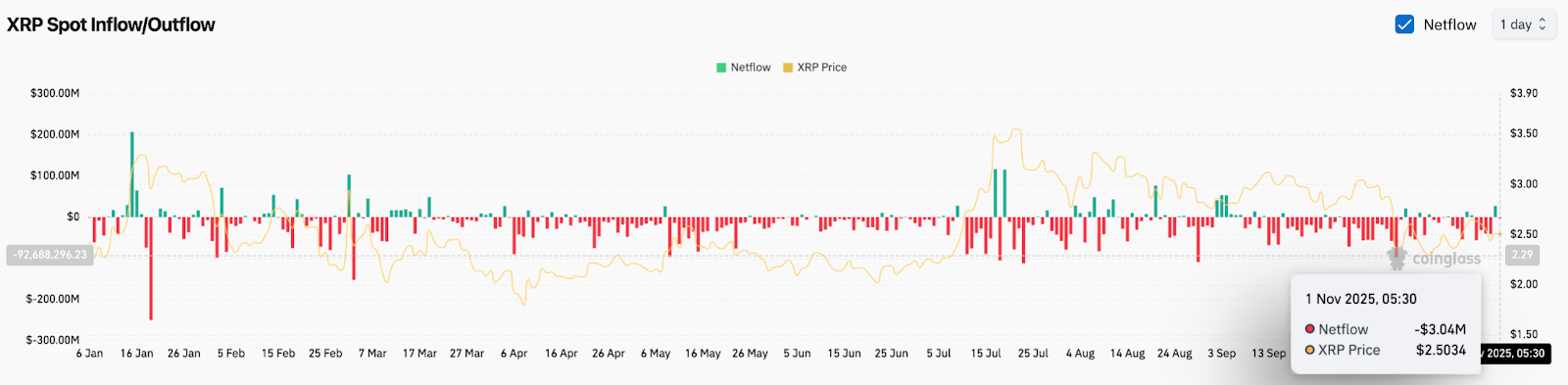 Los datos de Coinglass muestran una modesta salida neta de alrededor de USD 3 millones el 1 de noviembre, lo que sugiere una acumulación leve en lugar de una fuerte venta. Durante el último trimestre, los flujos han sido en su mayoría negativos, coincidiendo con el patrón de consolidación observado en el gráfico diario.