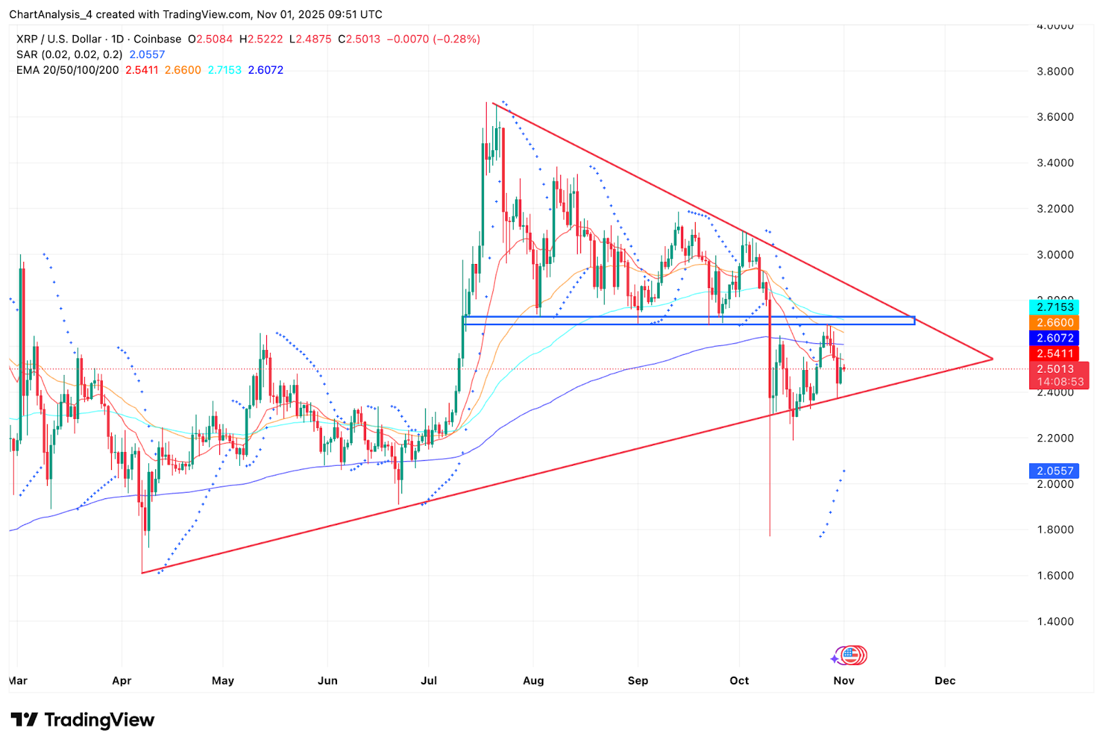 El precio de XRP hoy cotiza cerca de $ 2.50, manteniendo una base frágil después de caer por debajo del nivel de $ 2.54 que se alinea con su EMA de 20 días. El token se está consolidando dentro de un gran triángulo simétrico que ha dado forma a su acción de precio desde mayo. Los traders están observando la zona de $ 2.60 a $ 2.70 como la próxima área clave antes del lanzamiento de la custodia de XRP de 1 mil millones de Ripple y el posible lanzamiento de un ETF de XRP al contado a finales de este mes.