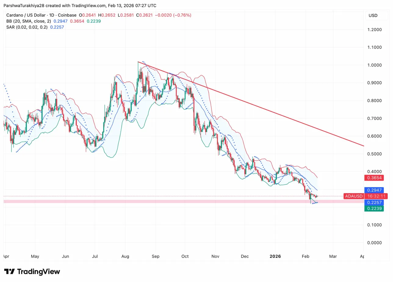 En el gráfico diario, Cardano ha roto por debajo del canal descendente que ha guiado la acción del precio desde agosto de 2025. Las bandas de Bollinger muestran la banda media en 0,2947 dólares, con el precio ahora muy por debajo de ese nivel. El SAR parabólico se sitúa en 0,2257 dólares, marcando la siguiente zona de soporte si la venta se acelera.