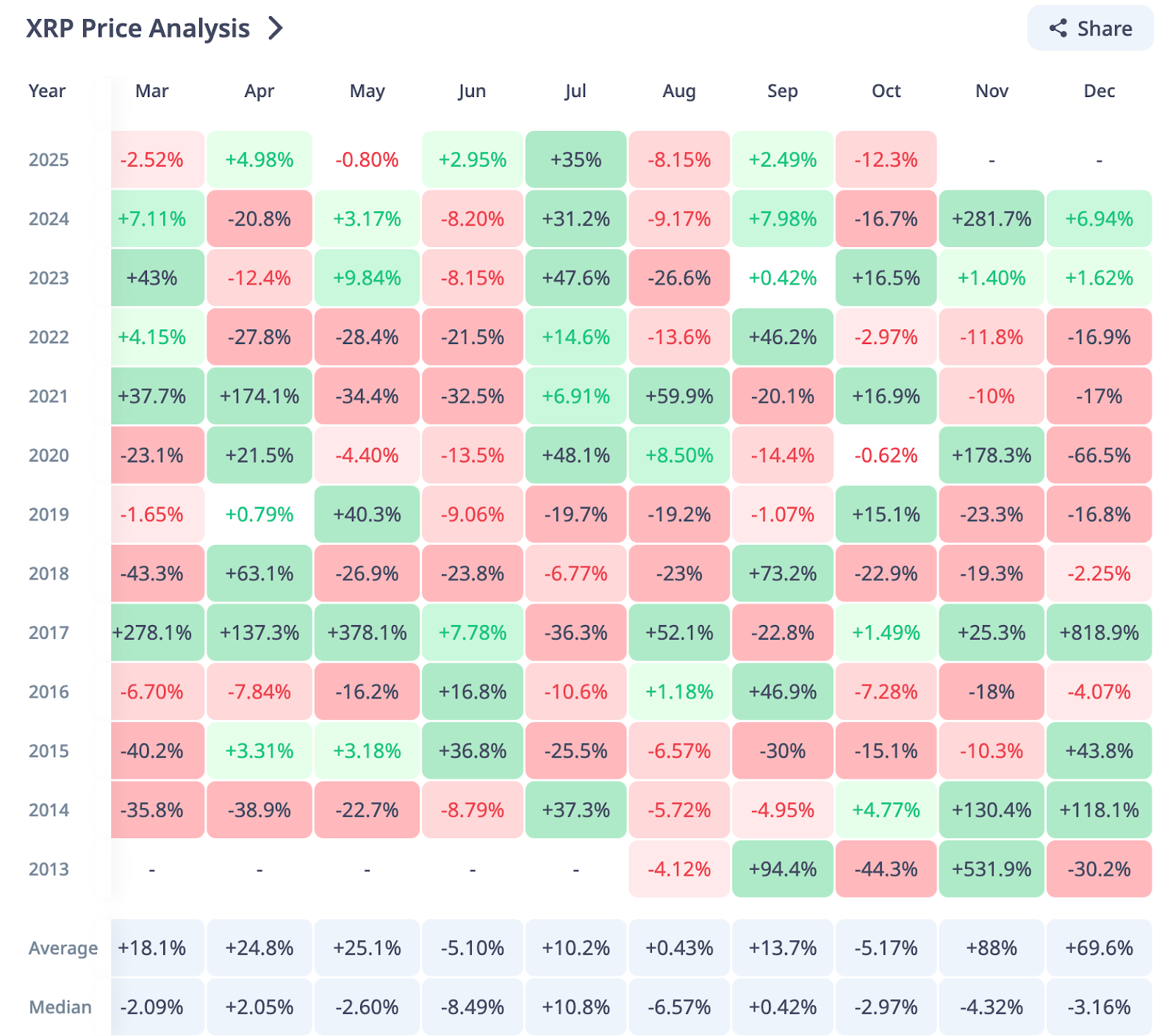 En promedio, noviembre registra una ganancia de +88%, lo que lo convierte en el segundo mes con mejor desempeño de XRP después de diciembre. Este patrón subraya cómo noviembre actúa con frecuencia como plataforma de lanzamiento para los repuntes de fin de año, a menudo marcando la pauta para las carreras alcistas de diciembre.