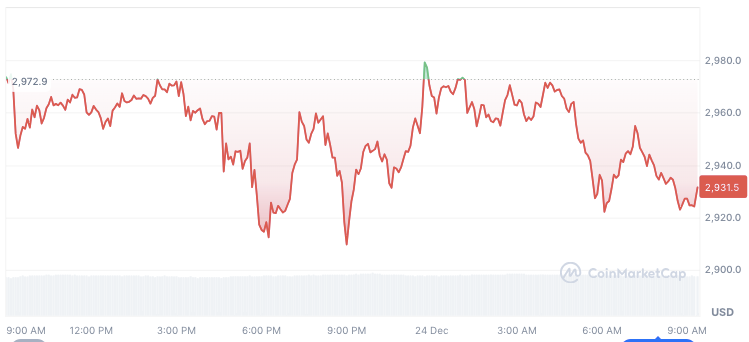 According to CoinMarketCap, Ethereum was trading at $2,931.38, with a 24-hour trading volume of $20.54 billion. The asset remains ranked second by market capitalization at approximately $354.0 billion, supported by a circulating supply of about 120.7 million ETH.