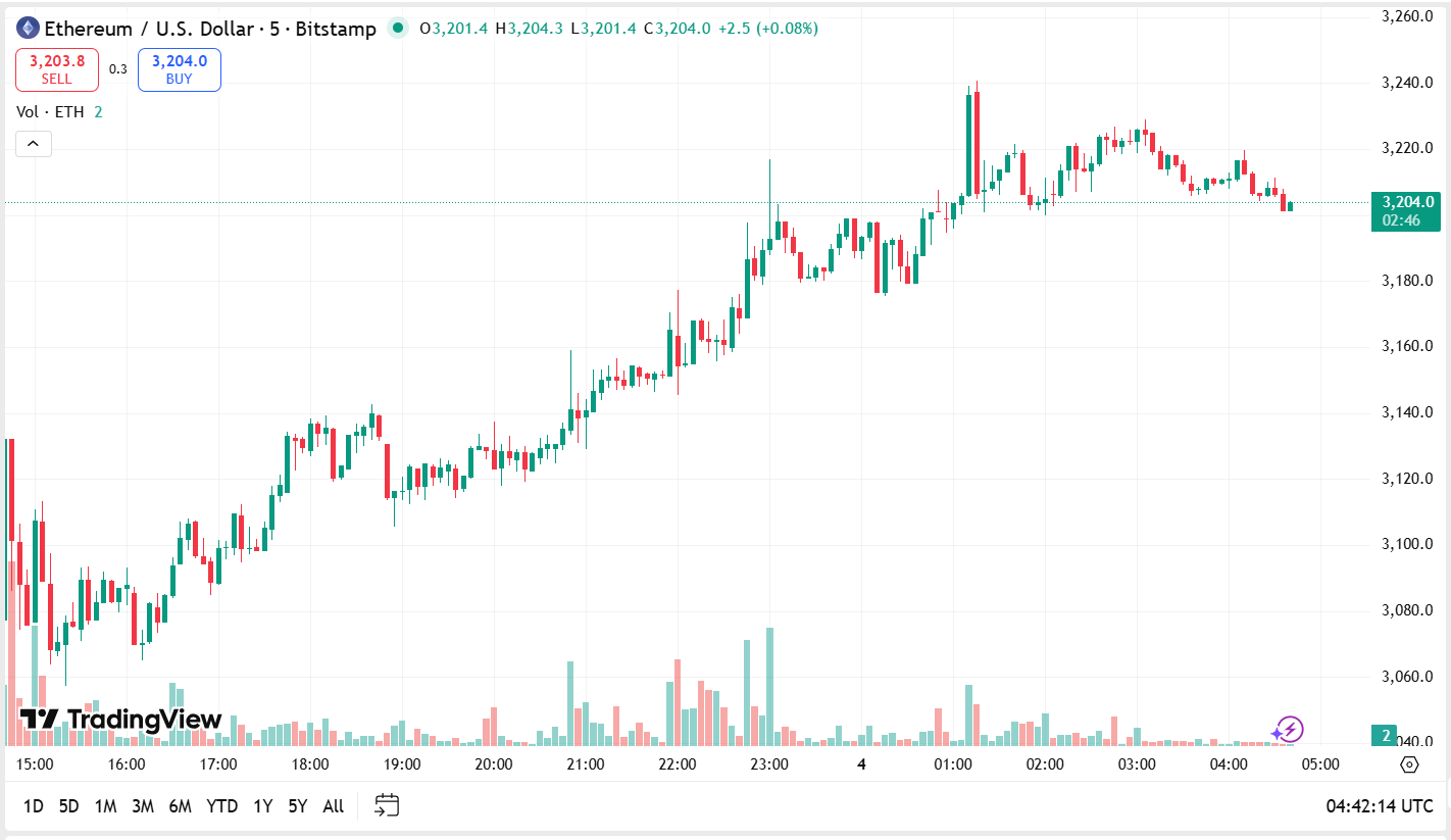 Ethereum has been one of the top gainers in the last 24 hours. ETH is trading around $3,205, up more than 5%, while Bitcoin remains comparatively flat near $93,401.