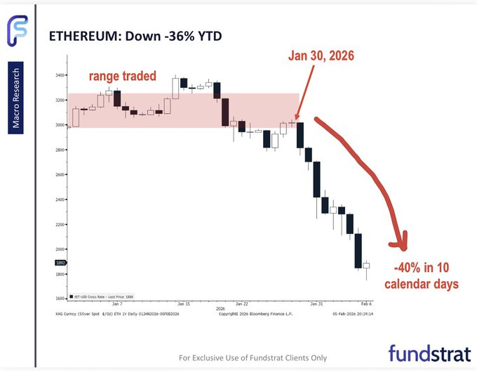 According to a chart shared by Fundstrat, Ethereum is already down about 36% year to date, with a break below the $3,000–$3,200 range around January 30, 2026. After that move, prices slid toward the $1,900 area over roughly 10 days, marking an additional drop of about 40%.