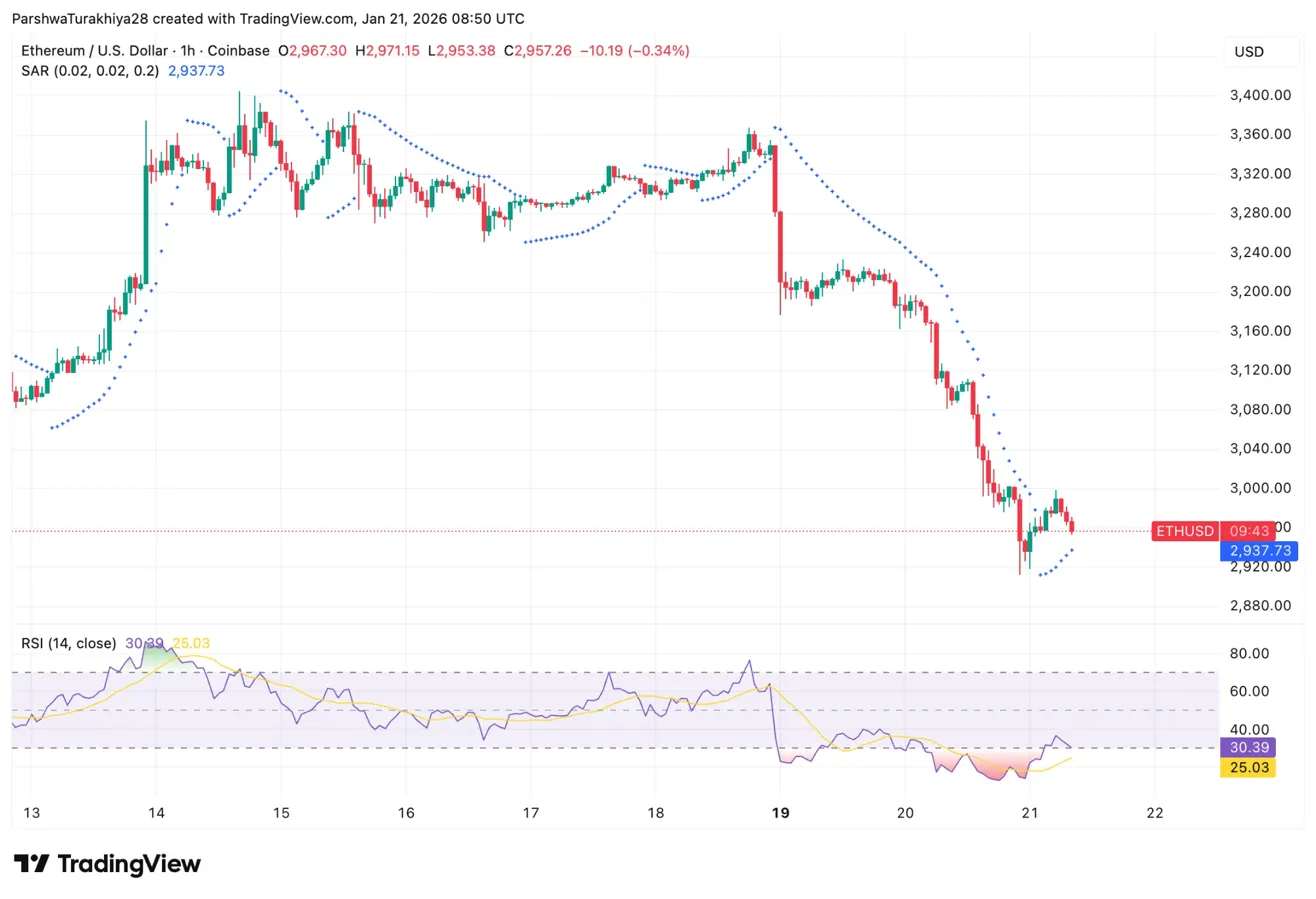 Shorter timeframes show the severity of the decline. On the hourly chart, ETH dropped from $3,370 to a low of $2,920 over just three sessions. The Parabolic SAR sits at $2,937.73, just below current price, suggesting that the immediate downtrend may be pausing.