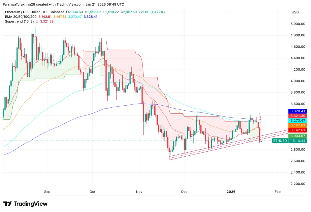 Ethereum price today trades near $2,957.50 after breaking below the descending channel that contained price action since the December low. The move marks the first close below $3,000 since early December, shifting the technical structure bearish even as institutional buyers step in.