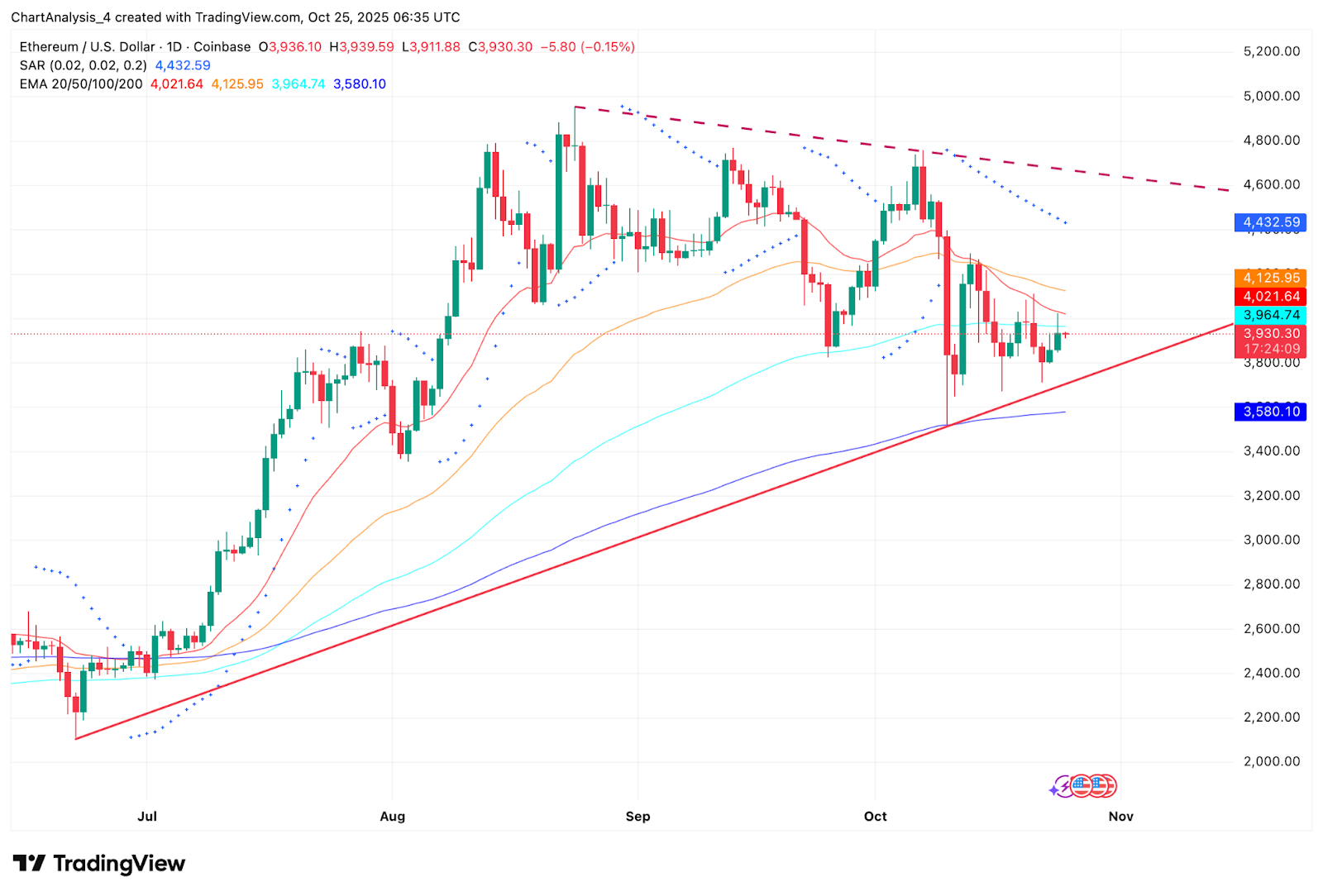 Ethereum price today trades around $3,930, sitting just above a rising trendline that has guided the market since June. While buyers defend this level, ETH faces clustered resistance across its moving averages, leaving traders watching whether institutional catalysts can outweigh near-term technical pressure.