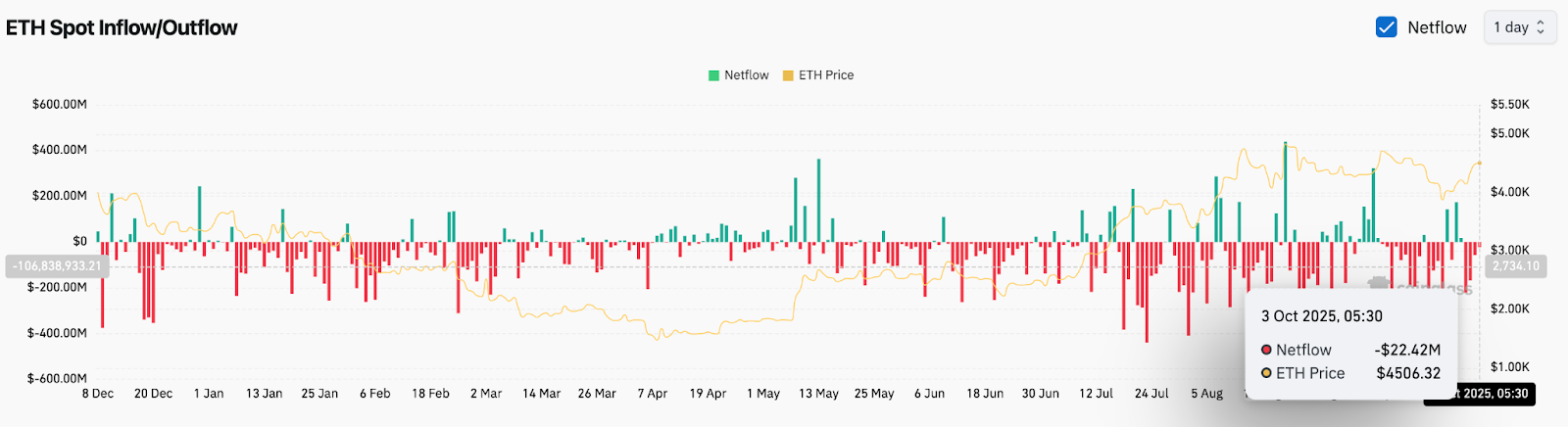 Exchange data shows $22.4 million in net outflows on October 3, highlighting modest accumulation as ETH reclaimed $4,500. While this suggests buyers are positioning on dips, flows remain uneven compared to July’s heavy accumulation streaks.