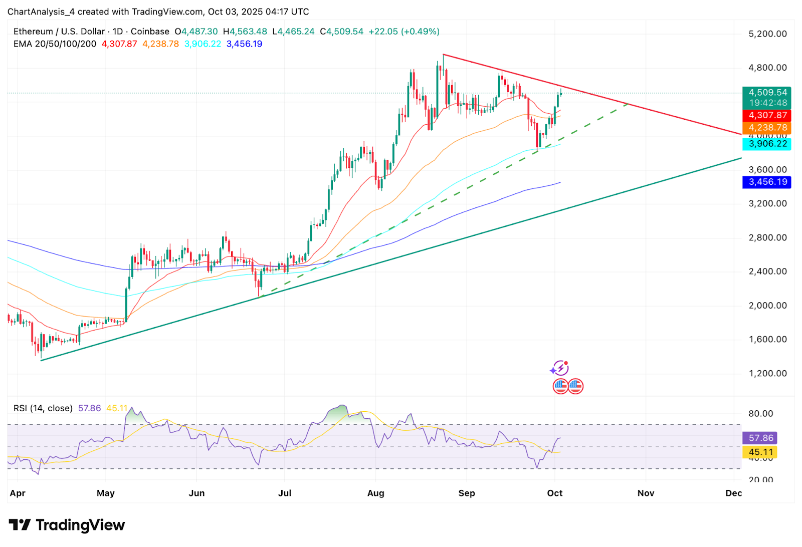 The daily chart shows Ethereum coiling within a symmetrical triangle pattern. Support is anchored by the rising trendline from April, converging with the 20-day EMA at $4,307. Resistance remains firm near $4,560, the descending line that has repeatedly rejected rallies.
