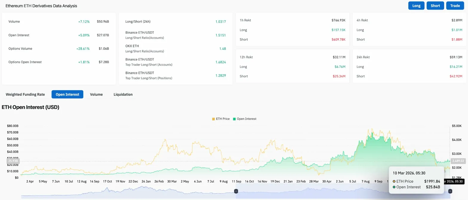 The liquidation data is the clearest signal. Over 24 hours, shorts absorbed $42.92M in liquidations against $16.21M for longs. That asymmetry shows sellers are being systematically squeezed as price reclaims $2,000. Options volume surged 28.61% to $1.06B while options OI rose 1.81% to $7.28B, reflecting increased hedging and directional bets as ETH attempts to hold this recovery.